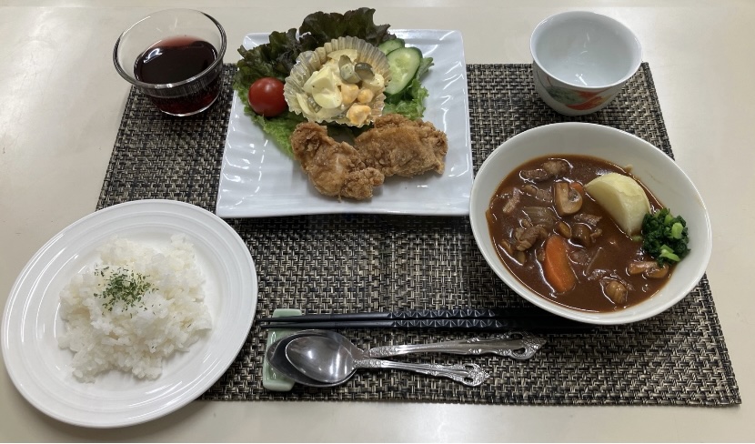12月の会食では、予算の関係で普段はなかなか使えない牛肉を使った料理に挑戦しました。濃厚なビーフシチューと、カリカリなチキン唐揚げで皆さんに喜んでいただきました。